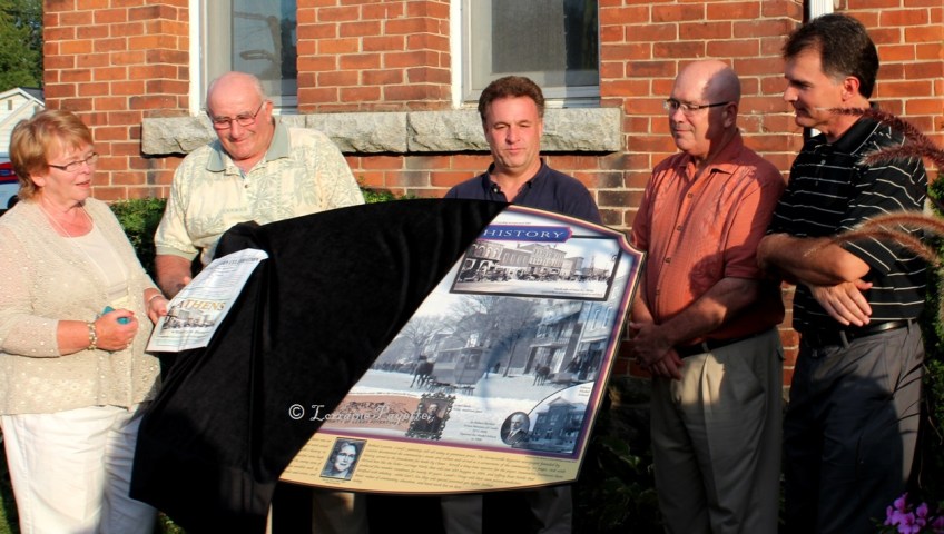 All of Athens came out to celebrate the installation and unveiling of their new Heritage Sign on August 8. L-r, Kathryn Hudson, Athens and Area Historical Society; Athens Mayor Herb Scott; MP Gord Brown and MPP Steve Clark, Leeds-Grenville; and Tom Russell, Thousand Islands Community Development Corporation.