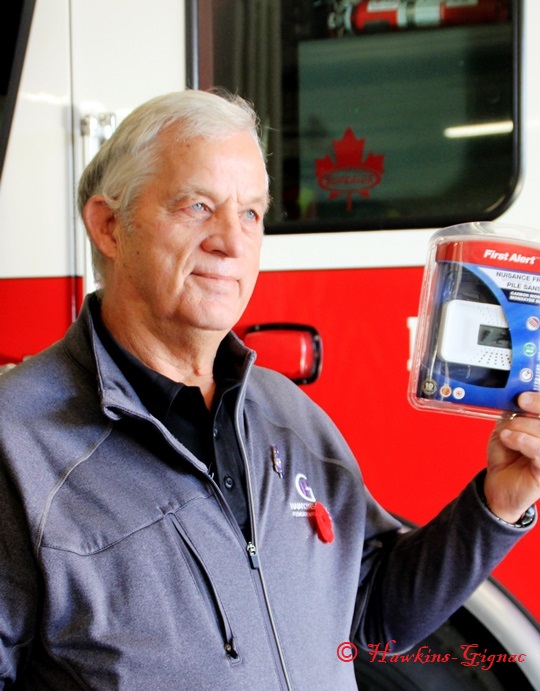 Carbon monoxide safety advocate John Gignac of The Hawkins-Gignac Foundation for CO Education joined First Alert in presenting a donation of 45 CO alarms to Fire Chief Gord Howard to be given to area homes in need to help ensure the safety of all residents. supplied by Conrad Galambos