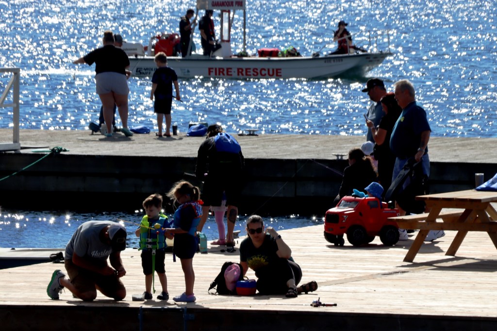 The wharf at the Thousand Islands Boat Museum (TIBM) in Gananoque filled up with eager young fisherfolk as the town’s first Catching Fish with Cops event took place on August 13 from 9 a.m. until noon. A free event for the community, it splashed over into Joel Stone Park as well and offered families a great opportunity to get out and enjoy each other’s company while experiencing the fun and relaxing adventure of catch and release fishing. The event was organized by the Gananoque Police Service and featured not only fishing but face painting, a bouncy castle, a display by the Gananoque Fireboat, rides on a vintage tugboat provided by TIBM, and a barbecue lunch with drinks.