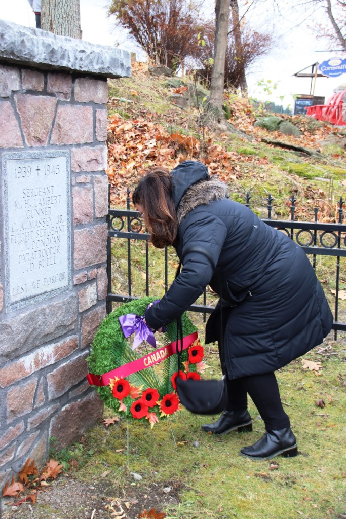“The service people, military, veterans and community members all went out to the Lansdowne Veterans Memorial to lay wreaths to honour our fallen and the veterans. You could see in their faces the feelings of pride, respect and thanks for the men and women who sacrificed for us and are still serving. Nancee Payne (mother of fallen local man Randy Payne) laid the first wreath for Mothers of Canada. She also laid the wreath for Afghanistan and in memory of her son.”